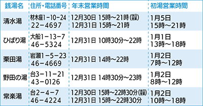同組合に加盟する市内5軒の銭湯では「初湯」(新年最初の営業日)に来場した先着50人に、ミニ乳酸菌飲料を進呈。各銭湯の年末年始の営業は表の通り。詳細はひばり湯【電話】0467・46・5324へ。