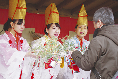厄を除け福を呼び、商売繁盛をもたらす「えびす神」を祭る同寺。境内で育った鳳凰竹に、打ち出の小づちやひょうたん、米俵などの縁起物が飾り付けられた「福笹」を参拝者が購入すると、地元から選ばれた福娘らが「商売繁盛、家内安全、お祈り申し上げまーす」と声を上げ、手渡していた。
