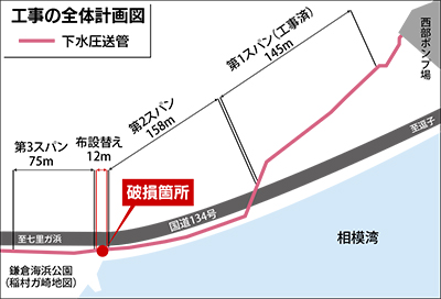 圧送管は、鎌倉地域の約1万7千世帯の下水を坂ノ下のポンプ場から七里ガ浜処理場に送っており、市は緊急処置として下水を消毒したうえで海に放流。その後、仮設管の設置と増設により海への放流を止めたものの、現在も仮設管が歩道をふさぎ通行できない状態が続いている。
