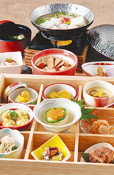 「きじま」が今夏から始めた昼限定の会席「四季彩御膳」=写真=が好評だ。9月4日(月)からは秋を先取りしたメニューにリニューアル。九つの升に美しい「合鴨の甲州松風焼き」、「天然海老の特製マヨネーズあえ」などが盛られる(2850円・税別)。このほか、秋鱧のすき鍋、松茸ごはんも堪能できる内容だ。この機会にぜひ。