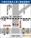 片側1車線のT字路交差点で、約100m離れたところにJR横須賀線の第二鎌倉道踏切がある小袋谷交差点。通勤時間帯や休日に踏切が遮断されると通行が滞り、市内有数の渋滞スポットとなっている。