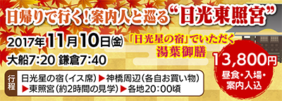 地元発着バスツアーでおなじみの「旅人(たびゅ〜と)」がこのほど、「案内人と巡る日光東照宮」ツアーを企画した。出発は11月10日(金)。