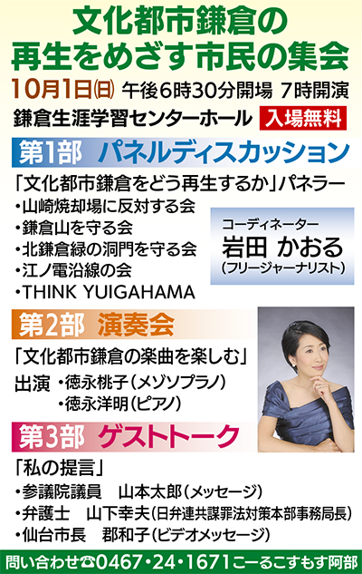 音楽を愛する鎌倉市民の団体が主催する「文化都市鎌倉の再生をめざす市民集会」が10月1日(日)、鎌倉生涯学習センターホールで開催されます。時間は午後6時30分開場、7時開演、9時終了予定です。入場無料。