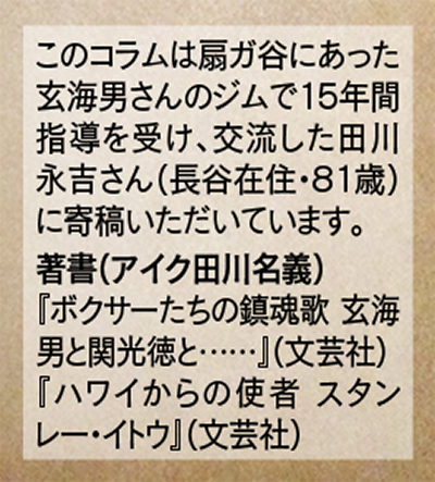 玄さんの魅力はなんだったのか。私が思うに、高いボクシング技術はもちろん、グローブを胸に合わせてクルリと一回転する粋な挨拶や、クリンチで逃げずに打ち合うファイトスタイルが観る者の心をつかんだのだろう。玄さんの人生における黄金期だった。 田川永吉