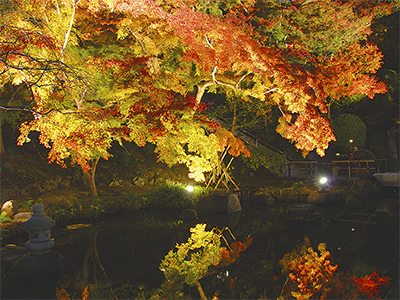期間中は特別に開門時間を午後6時まで延長(閉山は6時30分)。夕暮れとともに境内のいたるところに配置されたライトが灯り、幻想的な景色を演出する。