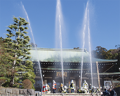市内植木の龍寶寺で1月24日、消防総合訓練が行われた。これは1955年に定められた「文化財防火デー」(1月26日)に合わせ、市消防本部が毎年実施しているもの。