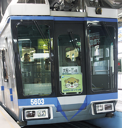 5603編成のブルーラインにカワウソのヘッドマークを装着。同社は「この車両を見てきっぷを購入した親子連れもいるなど注目を集めている。水族館に行く際はぜひモノレールの利用を」と呼びかけている。