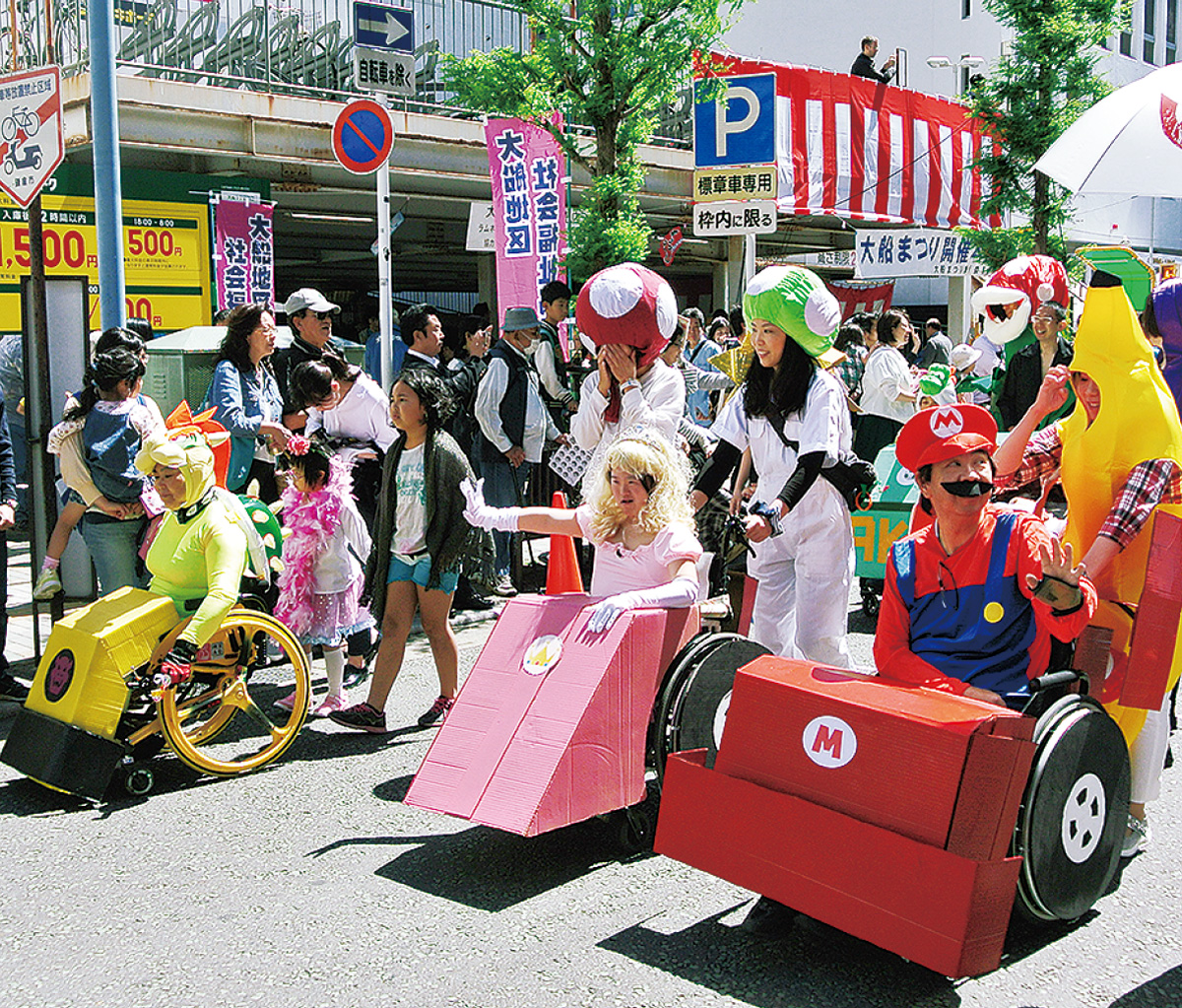 当日は車いすユーザーら18人の障害者が参加。「マリオカート」や「トーマス」など人気のゲーム、アニメのキャラクターに変身し、沿道から大きな拍手を浴びていた。