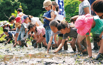 太陽が照り付ける中、子どもたちは合図に合わせて苗を一つひとつ丁寧に植えていった=写真。中にはバランスを崩して転び、体中泥だらけになっている子もいたが、「泥の感触が面白かった」と話していた。作業後は昨年田んぼで育て、収穫した米で作ったおにぎりを皆で味わった。
