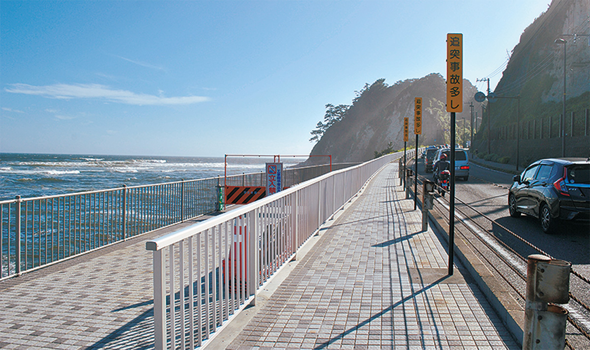 稲村ガ崎で発生した地盤沈下による下水圧送管の破損を受けて、約2年にわたって通行止めが続いていた国道134号沿いの歩道の通行が、6月29日から再開された。