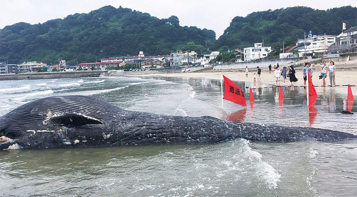 由比ガ浜海水浴場で8月5日、波打ち際にクジラが打ち上げられているのが見つかった。午後2時30分ごろ、市民から110番通報があり、市と新江ノ島水族館の職員らが確認。体長約10m60cmで、すでに死んでいた。