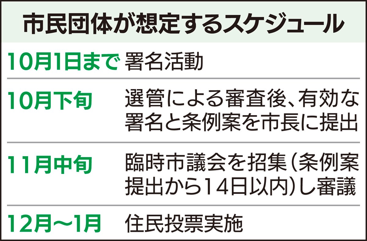 集まった署名は選管が審査し、有効なものが基準を超えれば条例案とともに市長に提出。臨時市議会で審議が行われる予定だ。同会では「早ければ今年12月から来年1月にも住民投票が実施できるのでは」とする。