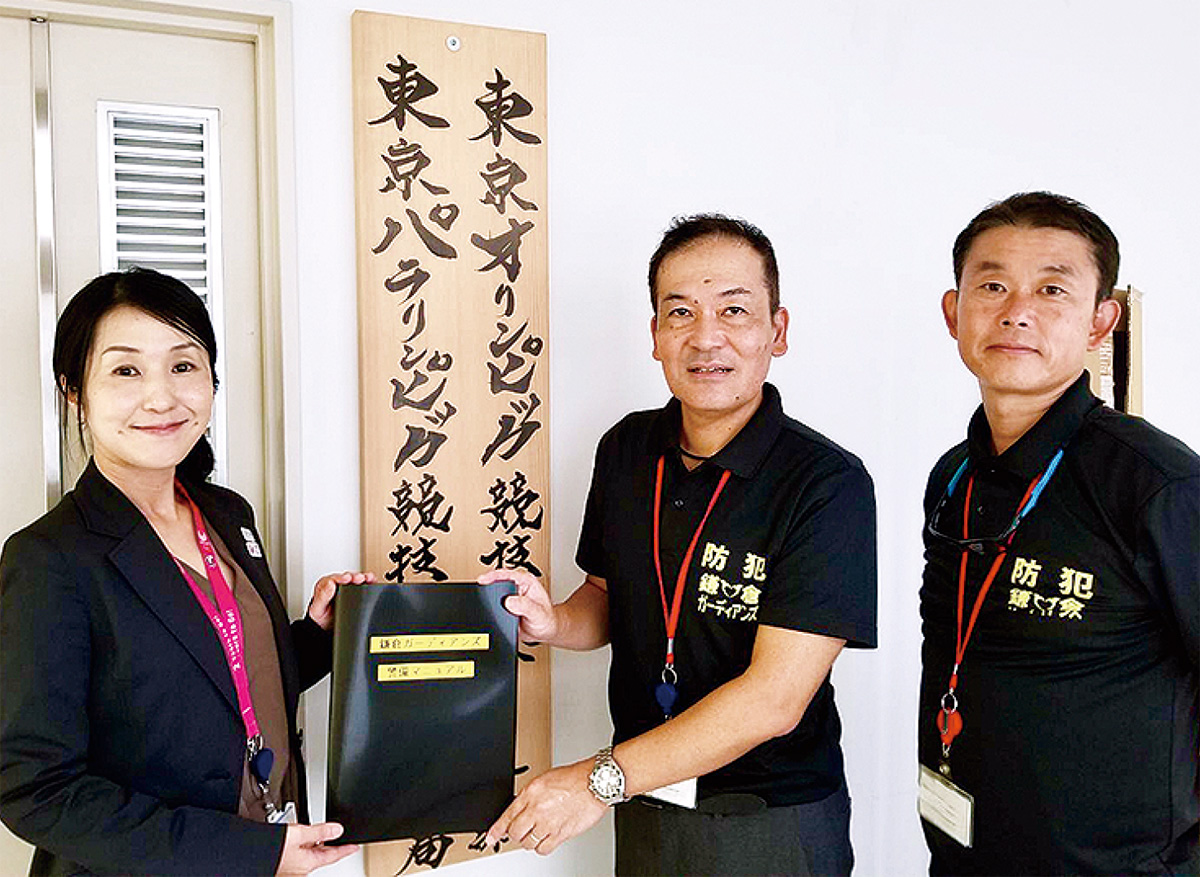 防犯・防災ボランティア団体「鎌倉ガーディアンズ」が10月12日、内閣官房東京オリンピック競技大会・東京パラリンピック競技大会推進本部事務局を訪問し、警備マニュアルを手渡した=写真。