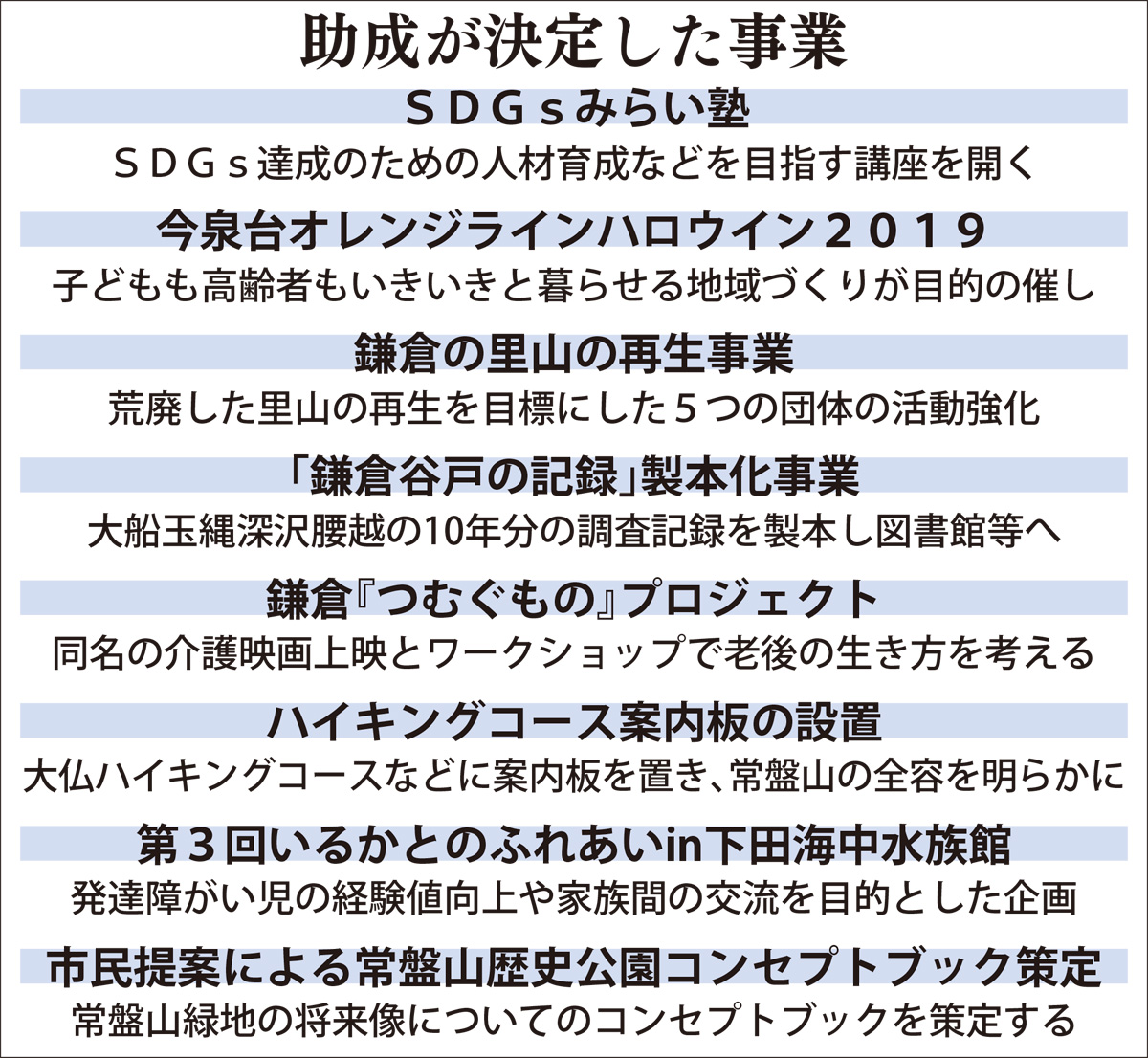 このほか、子どもも高齢者もいきいき暮らせる地域づくりを目的に10団体が協働する「今泉台オレンジラインハロウイン2019」や、5団体からなる北鎌倉さとやま連合会の「鎌倉の里山の再生事業」などが選ばれた。