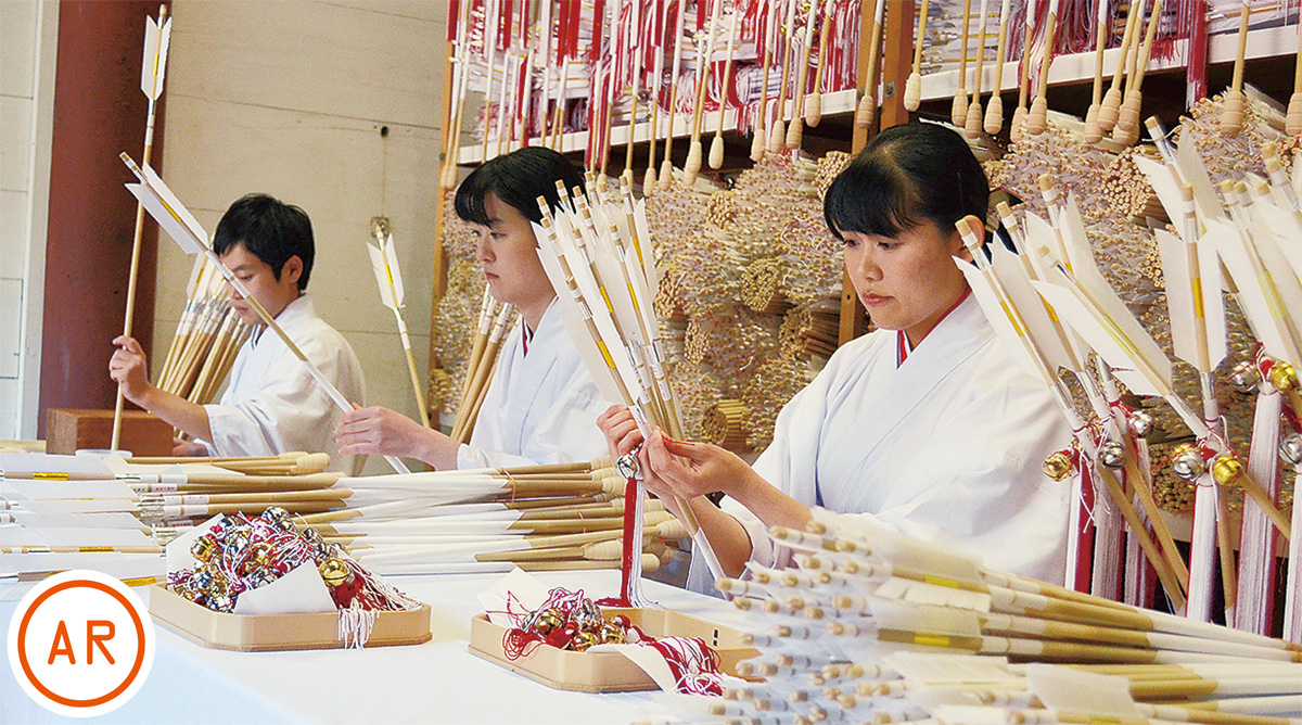 いくつも積み上げられた矢の束を背に4人の巫女らが並び、矢の先端に鏑を取り付け、軸に和紙を巻き、水鳥の羽の下に金銀の鈴と紅白の飾りを順に付けていった。