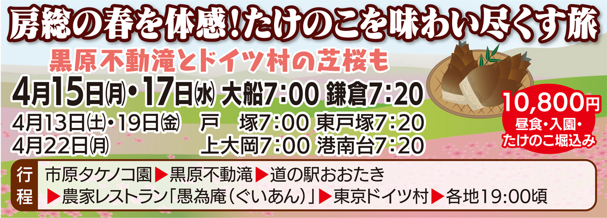地元発着バスツアーでおなじみの「旅人(たびゅ〜と)」がこのほど、「房総の春を体感!たけのこを味わい尽くす旅」を企画した。日程は4月15日(月)と17日(水)(戸塚区方面から13日(土)・19日(金)、港南区方面から22日(月)の発着便もあり)。