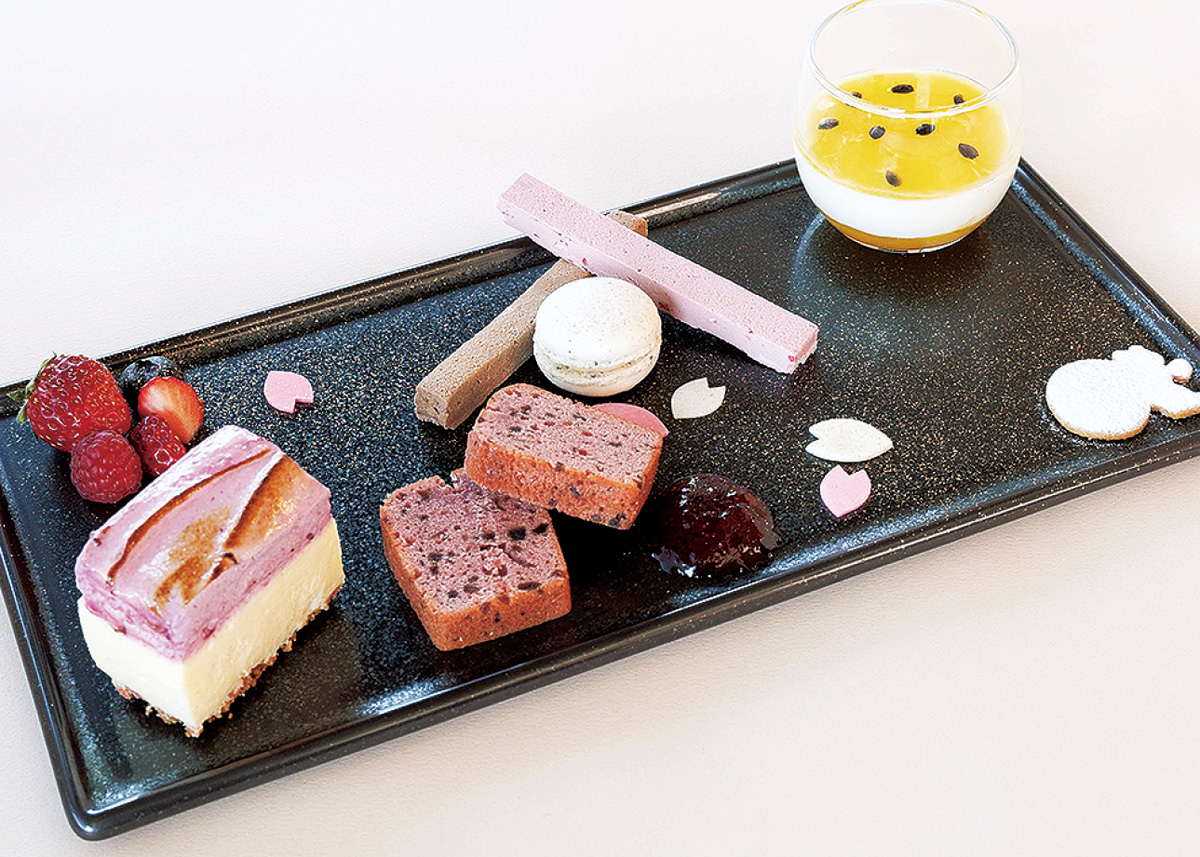 正面左から「クリームチーズとベリーのシブースト」「桜と香り豊かなアマレーナチェリーのパウンドケーキ」「ジャスミン茶のマカロン」「2種類のエアリーチョコレート」「ココナッツブラマンジェ」など春を告げる多彩なデザートが揃う。1400円(税抜)。