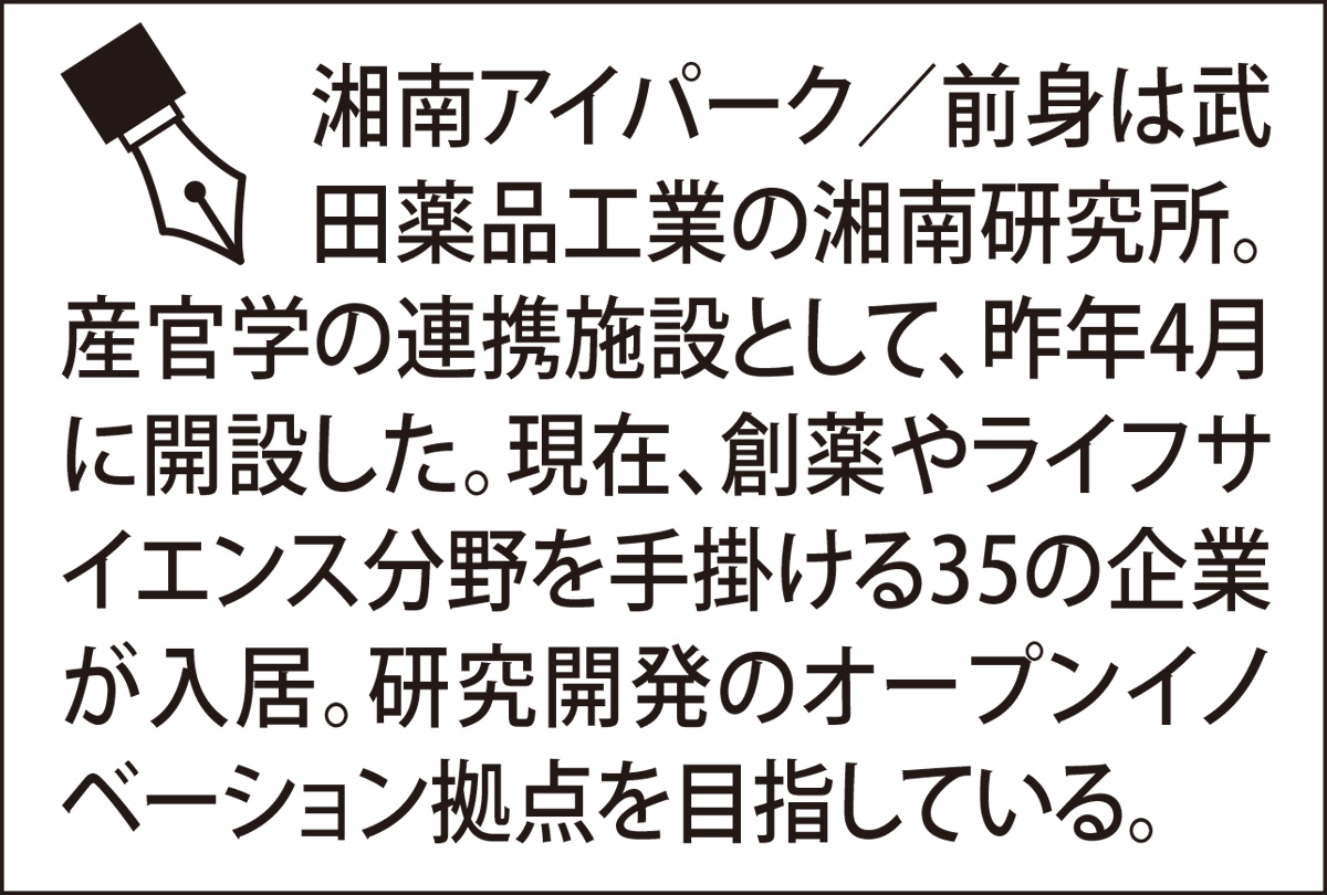 「ここは元々武田薬品の湘南研究所として医薬品の研究開発を行っていましたが、昨年、ライフサイエンスに関わる企業や大学が多数集まる施設『湘南アイパーク』に生まれ変わりました。武田薬品は引き続き施設内で研究を進めていますが、武田薬品に加え様々な業種の企業や団体が新たに入居したことで、それぞれが連携しながら研究の幅を広げています」