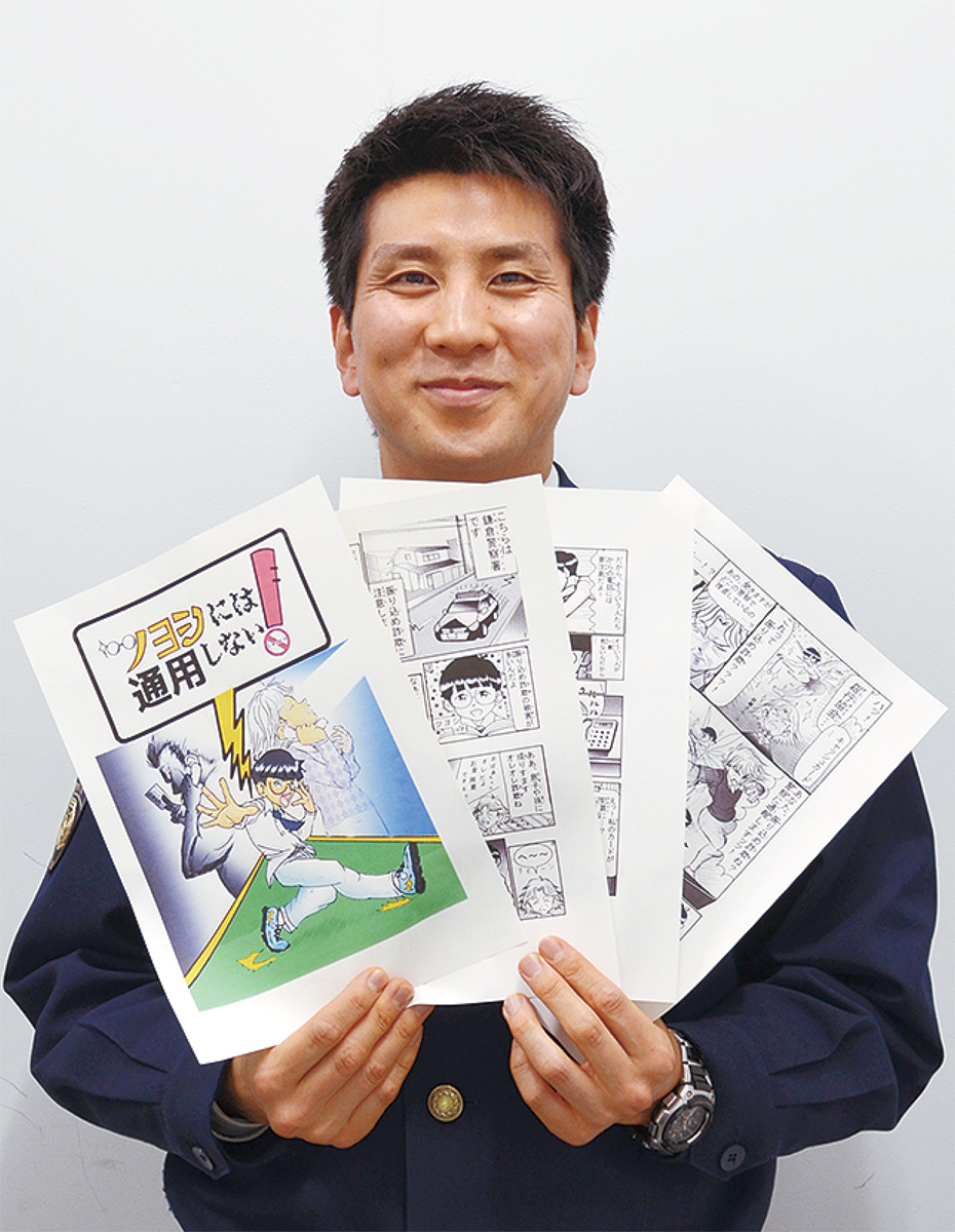 地域の家庭を訪問する巡回連絡の担当地域から振り込め詐欺の被害者が出てしまい、悔しい思いをしたという吉田さん。漫画は防犯教室などでも利用されており「漫画ならより印象にも残りやすく、家族で話題にしやすいはず。すでに続編の構想も練り始めています」と笑顔を見せる。