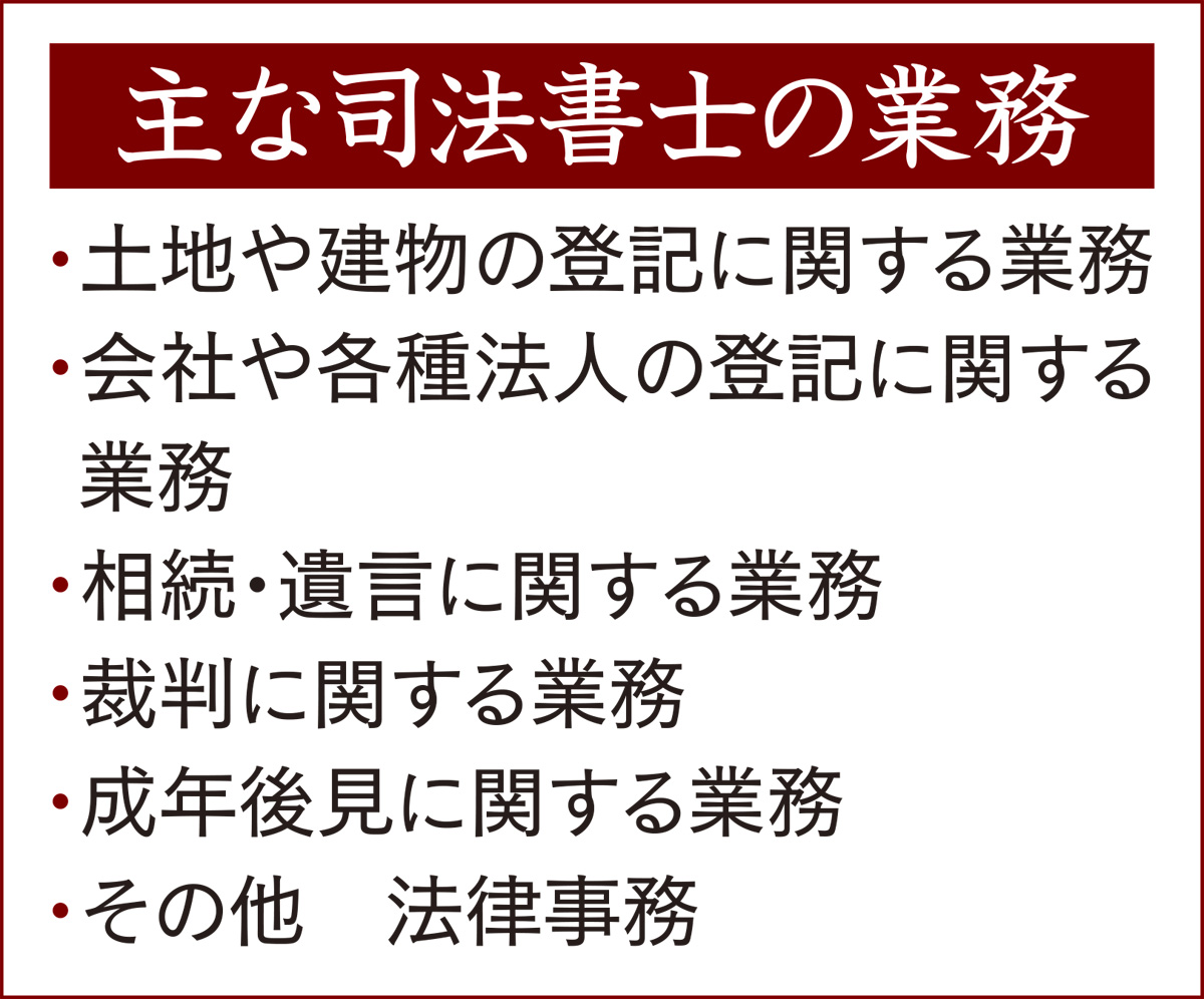 「身近な法律家」とも呼ばれる司法書士。土地・建物の登記や会社の設立、相続業務、裁判業務など、暮らしに身近な法律手続きなどの事務を行っている(左表参照)。