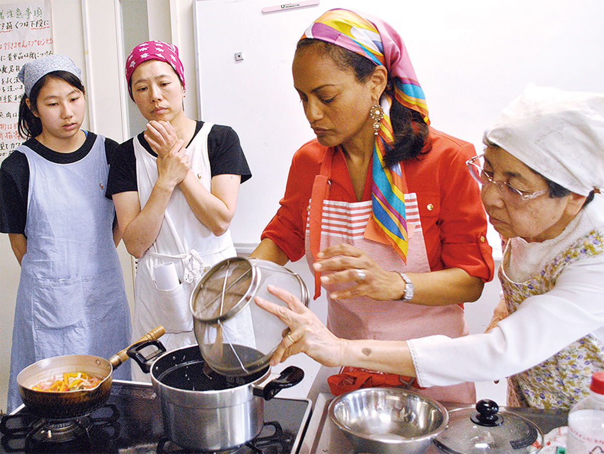 日本人に他国の文化を知ってもらおうと、8年前から続く恒例イベント。16回目となった今回は、駐日ジャマイカ大使夫人のスザンヌ・アリコックさん(51)指導の下、参加した25人がジャマイカ料理作りに挑戦した。