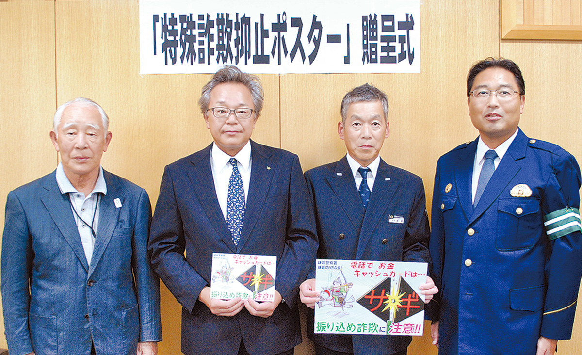 鎌倉警察署(猪俣秀彦署長)は10月1日、「特殊詐欺抑止ポスター」を京浜急行バス鎌倉営業所とタクシー会社のKGグループに贈呈した。今後、両社が運行するバスやタクシーの車両内にポスター約140枚を掲示し、利用者に対して注意喚起をしていく。