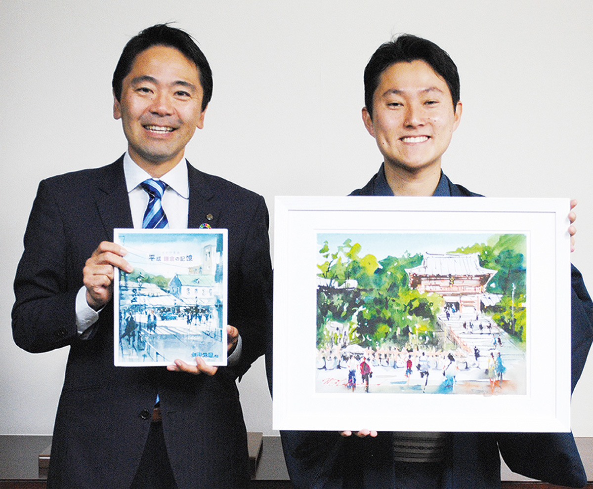 浄明寺在住の水彩画家・矢野元晴さん(31)が10月18日、鎌倉市役所を訪れ、松尾崇市長を表敬訪問した。