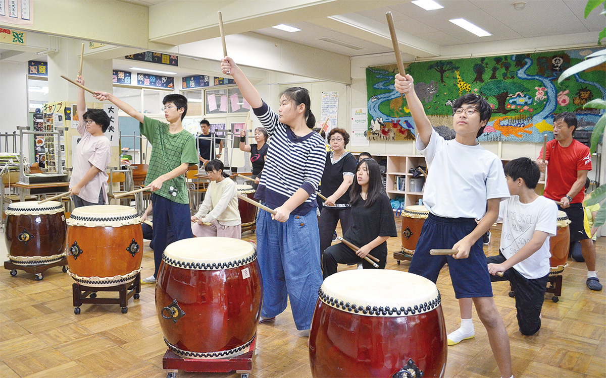 知的障害などがある子どもが所属する特別支援学級「8組」では、地域で活動する女性和太鼓グループ「玉縄太鼓」の指導の下、10年以上にわたって総合的な学習の授業の中で和太鼓の演奏に取り組んできた。