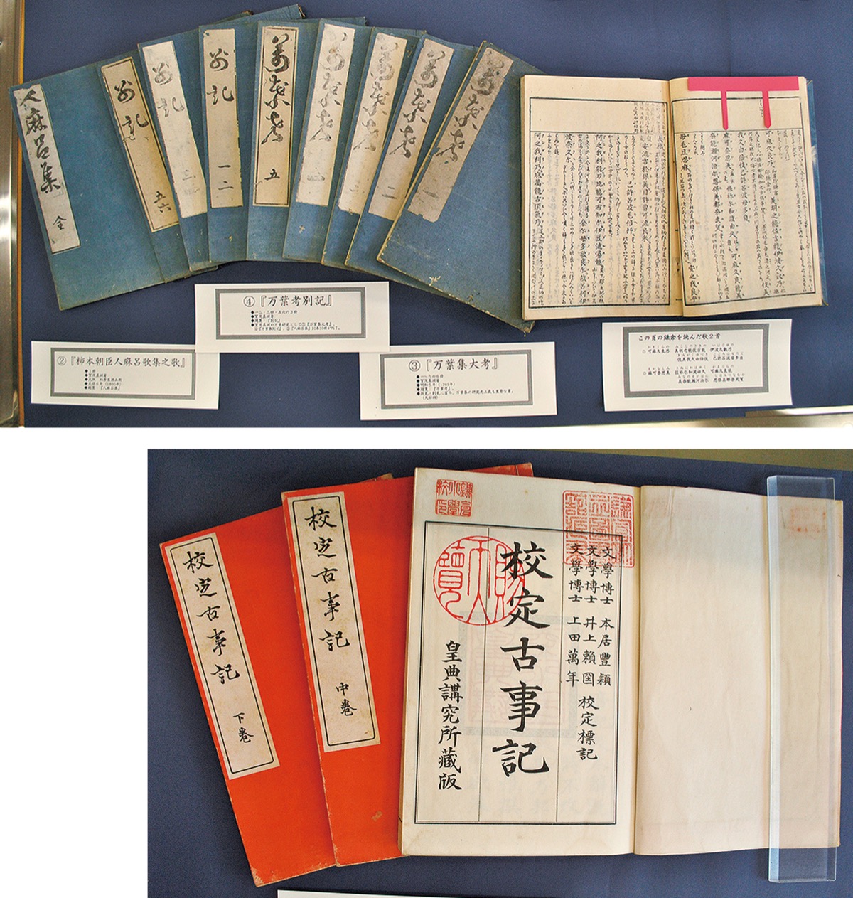 同館には現在、鎌倉小学校(現・第一小学校)から寄贈された「校定古事記」(本居宣長著・本居豊頴・井上頼国・上田萬年校定標記・1911年)や、鎌倉を詠んだ歌が記されている「万葉集大考」(賀茂真淵著・1769年)といった関東大震災を乗り越えた貴重な書籍など、11点が展示されている。