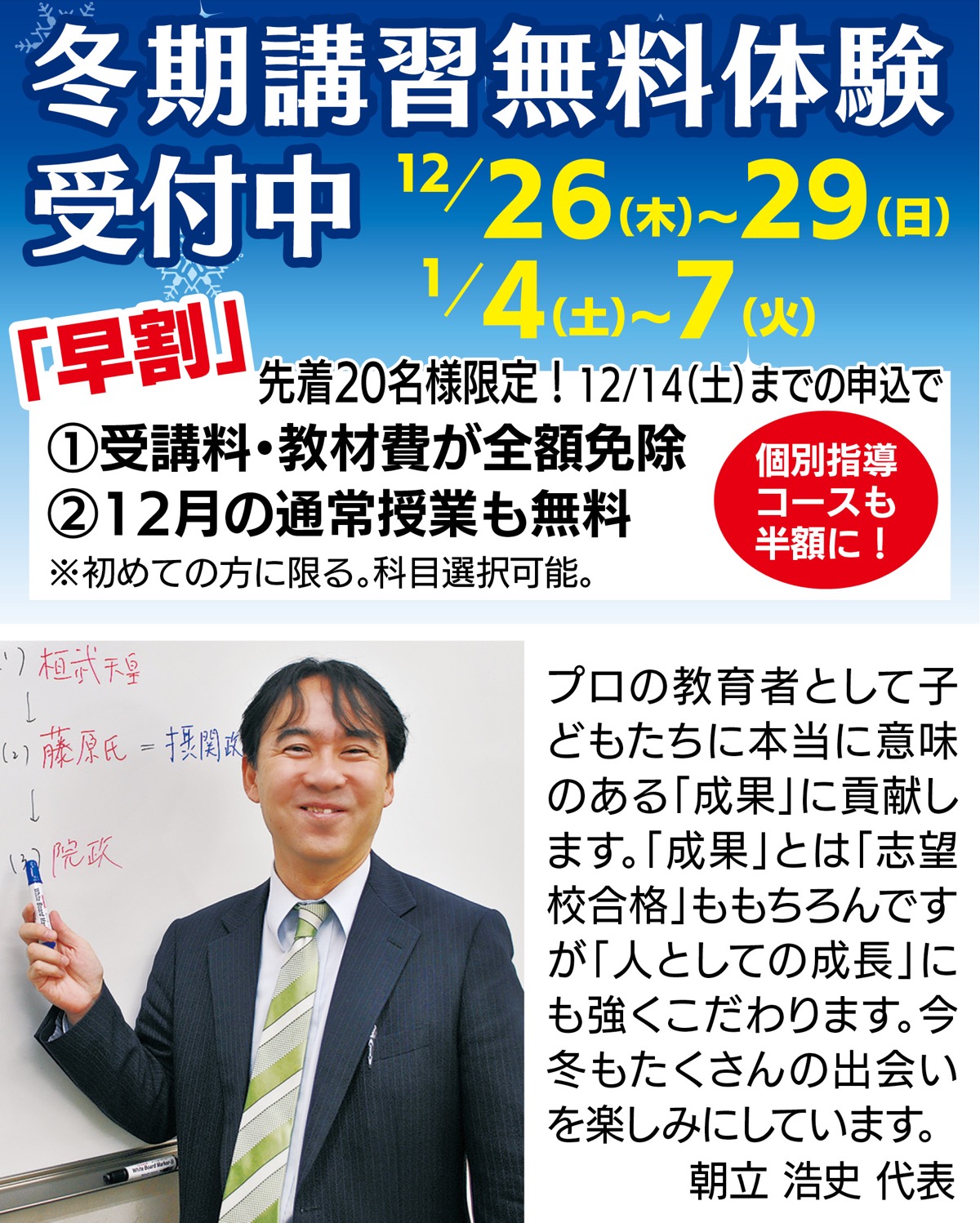 小学1年から高校3年まで、国算(数)理社英5科目を学べる同塾。12月14日(土)までの申し込みで先着20人限定「早割」が適用され、受講料が掛からないだけでなく、教材費も無料になる。