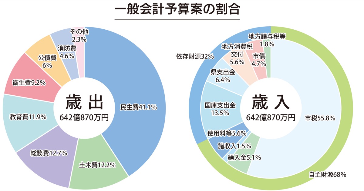 目的別では、保育所、認定こども園に対する給付事業や障害者の介護給付事業など、福祉等に充てる経費である民生費が41・1%、ふるさと寄附金推進事業や本庁舎等整備事業などにかかる総務費が12・7%と大きな割合を占める。