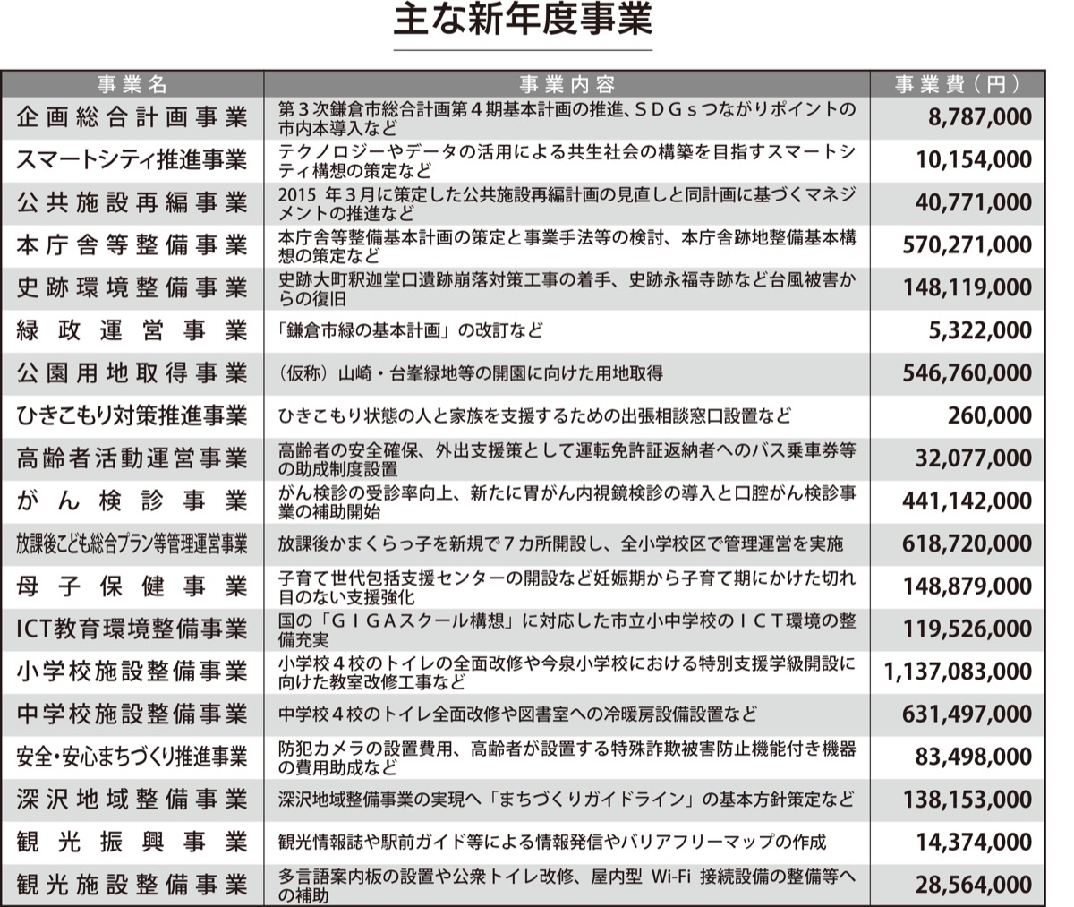 「災害対策や環境負荷の低減といった『守り』と、深沢地域整備事業、スマートシティ構想の策定など未来に向けた『攻め』のバランスをテーマにした」(松尾崇市長)として、緑の維持管理、市民に正確な災害ハザード情報を提供するための「公開型GIS防災マップ」の運用開始、避難所で使えるパーテーション、簡易型シャワー、発電機の備蓄などの防災施策、ペットボトルの発生抑制を目的としたウォーターサーバーの設置、レジ袋の削減などの環境負荷の低減、特殊詐欺被害防止機能を有する機器への費用助成や、運転免許返納者にバス乗車券等の購入助成を行うなど高齢者施策、国の「GIGAスクール構想」に対応した市立小中学校のICT教育環境の整備・充実、市立小中学校全校の図書館への冷暖房設備設置のほか、放課後かまくらっ子を新たに7校で開設、ひきこもり支援、障害者の就労支援、深沢地域の整備については「まちづくりガイドライン」の基本方針策定など、21年度の都市計画決定に向けた準備を進める、とする。