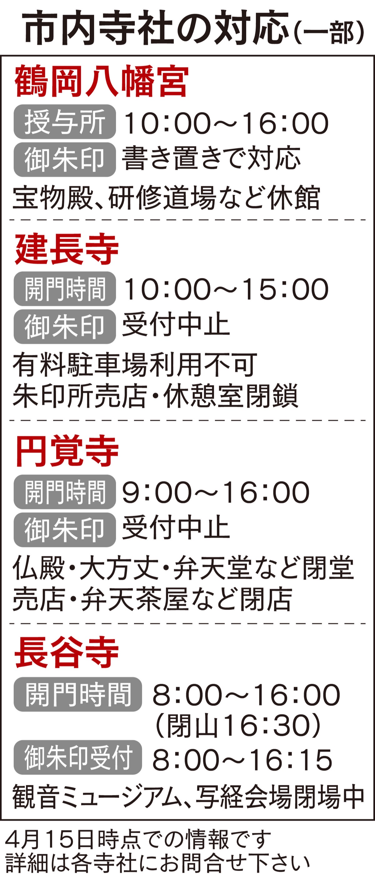 市内の寺社も感染防止のため、拝観時間の短縮や御朱印の配布を中止するなどの対策をとっている(左表)。