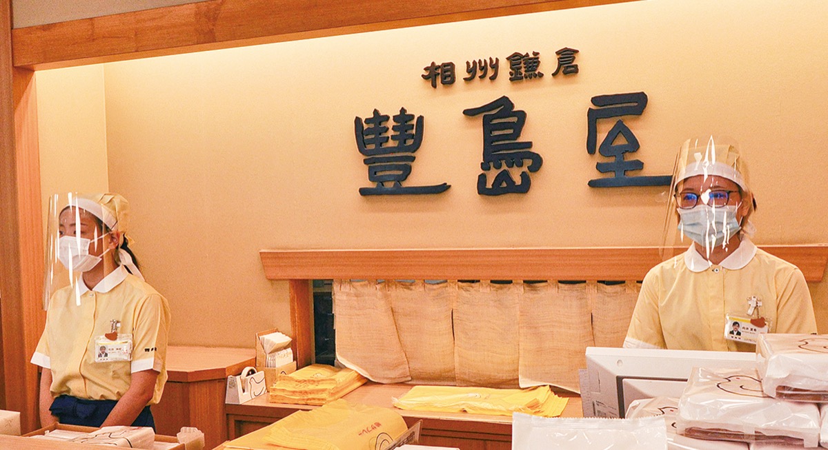 「鳩サブレー」の豊島屋は5月27日、若宮大路沿いの本店で営業を再開した。店舗入り口にはアルコール消毒液を設置、従業員はフェイスガードを着用したうえで接客を行っている。