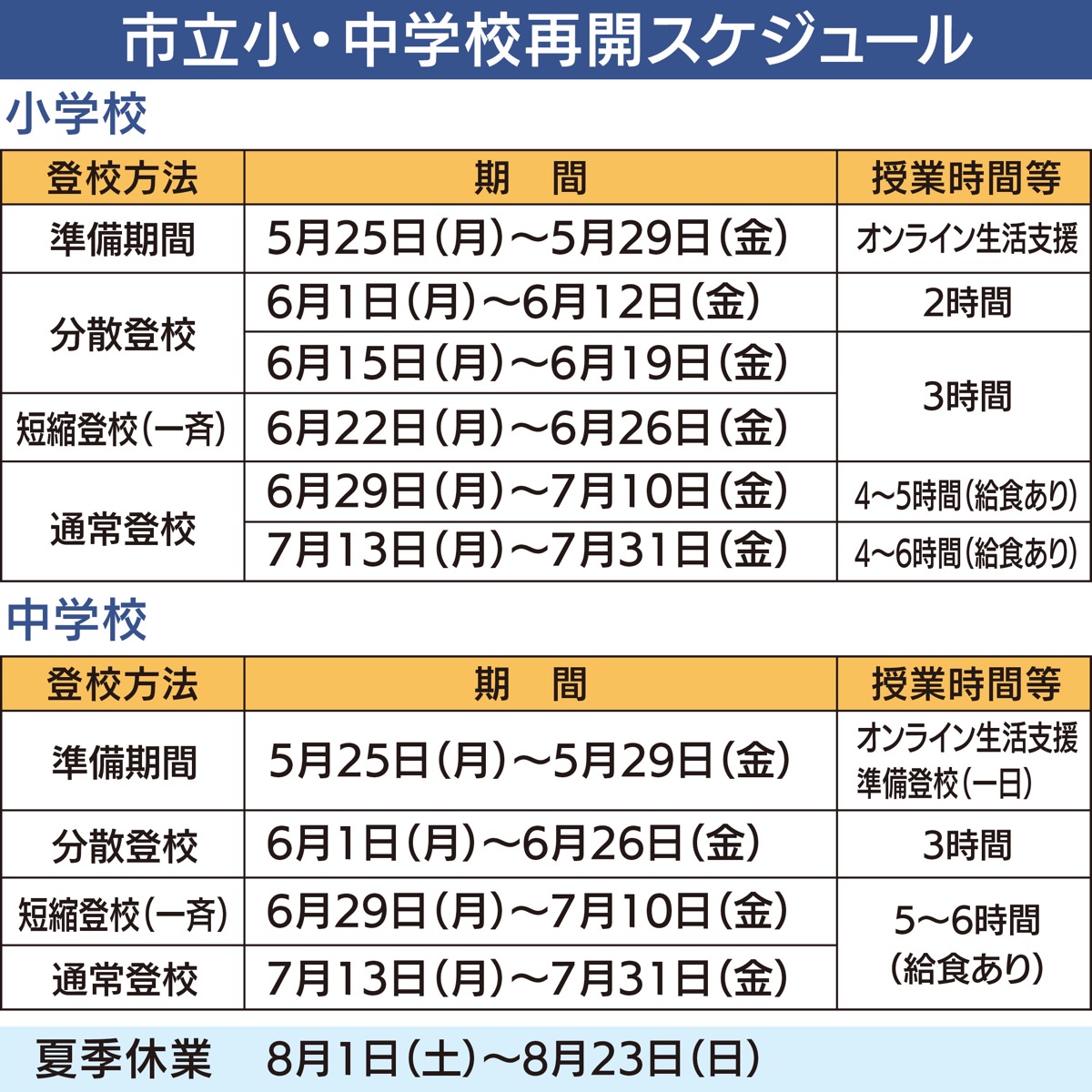 鎌倉市は5月25日、市立小・中学校の6月再開に向けたスケジュールを発表した(左表)。