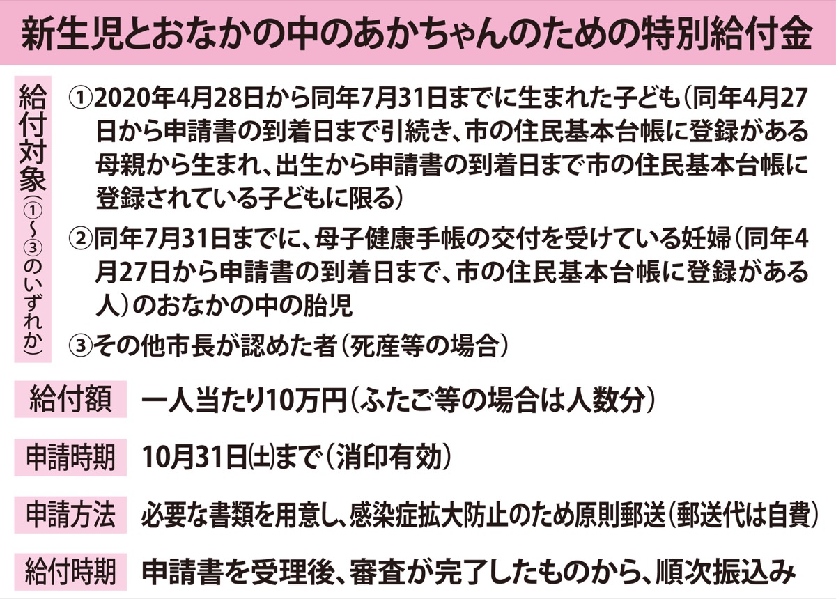 対象は、4月28日から7月31日までに生まれ、市の住民基本台帳に登録されている子どもや、同日までに母子健康手帳の交付を受けた妊婦の胎児など。いずれも母親が4月27日から申請書到着日まで転出入していない人に限る。死産等の場合も申請可能。