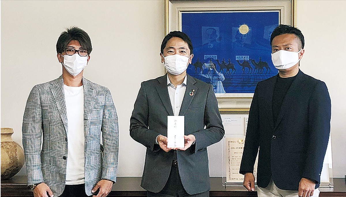 鎌倉ビール醸造株式会社の對馬一喜社長と今村広太郎専務が8月25日、松尾崇市長のもとを訪れ、新型コロナウイルス感染症対策の支援のための寄付金を手渡した。