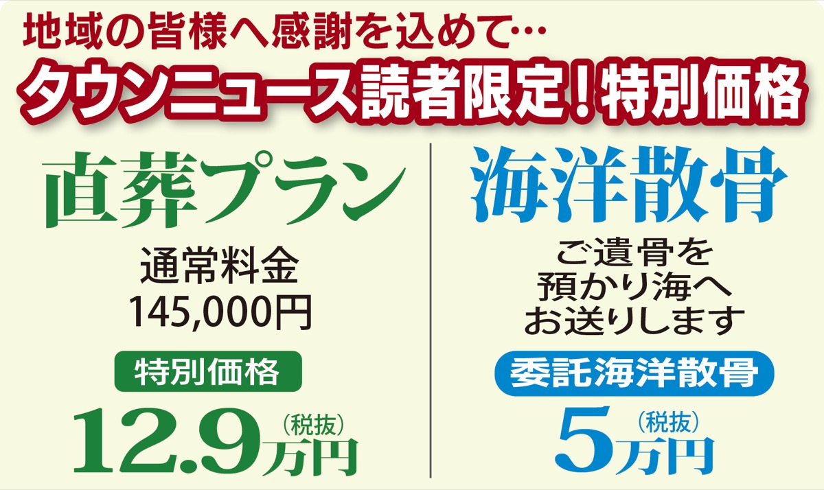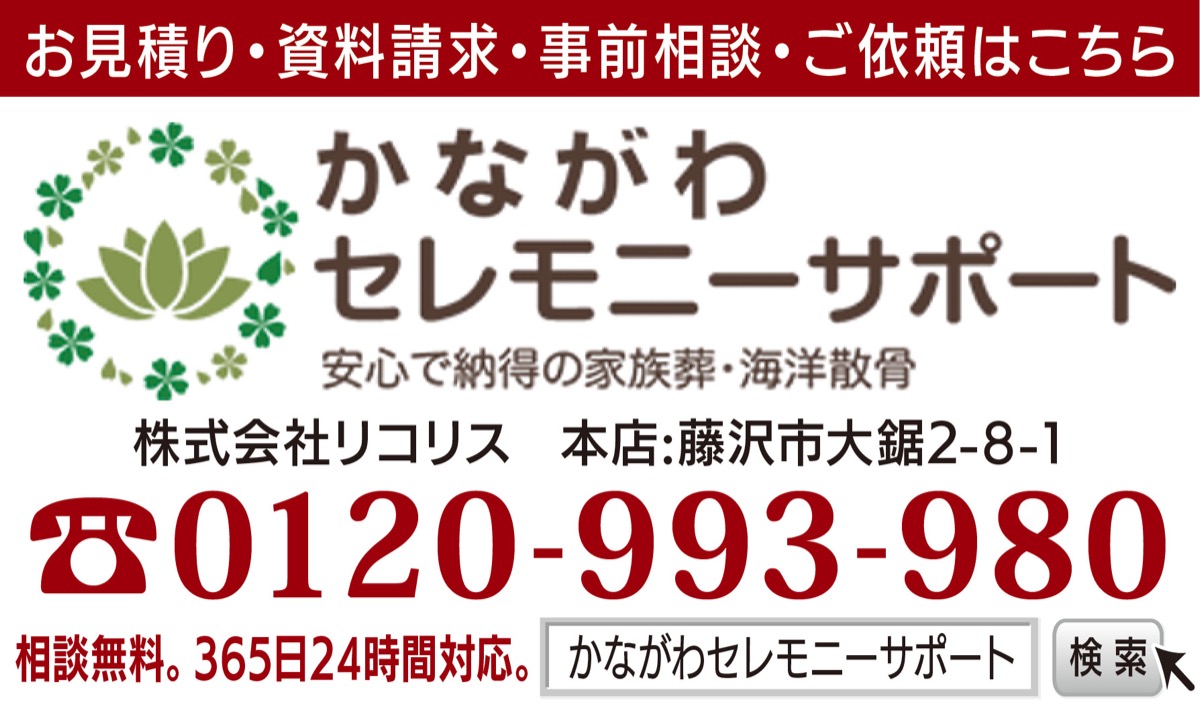 手がけるのは、地域密着の葬儀社「かながわセレモニーサポート」。適正価格・追加料金一切不要の明朗会計が自慢で、生花店と特別契約をしているので華やかな花祭壇を用意。価格以上の”質”を感じられる葬儀を実現してくれる。「葬儀社は比較して検討を。費用や内容、緊急時の対応などに大きな違いがあります」と同社。これまで5千件以上の葬儀に立ち会ってきた経験豊富なスタッフが事前相談から一貫してサポートしてくれる。相談無料。今なら特別プランも用意。