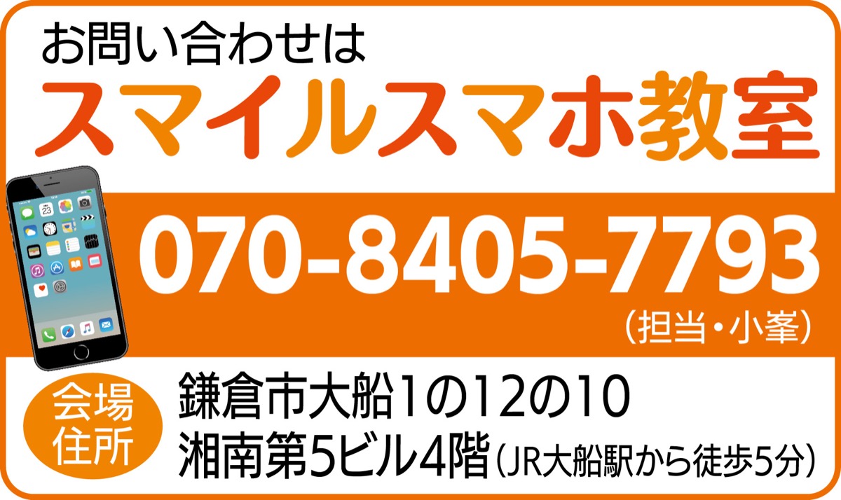 60歳以上のシニア世代を中心に「スマホを持っているけど使い方が分からない」という人は多い。そこで鎌倉市や藤沢市で大好評のスマイルスマホ教室では、毎週月曜日と木曜日に、JR大船駅から徒歩5分の場所にある「NEKTON大船」(大船1の12の10湘南第5ビル4階)で、スマートフォン教室を開催している。
