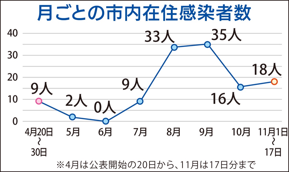 感染者の在住地が公表されるようになった4月20日以降の市内の感染者数は、4月20日〜30日が9人、5月が2人、6月が0人、7月が9人といったんは落ち着きを見せたものの、「第2波」と言われる8月が33人、9月が35人となった。10月は16人と減少に転じたが、11月は17日時点で18