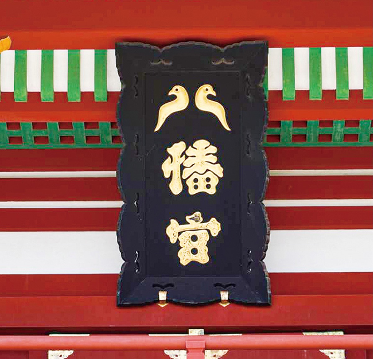 源氏の守り神として崇(あが)められた鶴岡八幡宮。後に豊臣秀吉や徳川家康などの為政者たちにも篤(あつ)く崇敬された日本を代表する八幡宮である。本宮には縦約108cm、横約56cm、「八幡宮」と記された扁額(へんがく)が掲げられているが、この「八」の字をよく見ると2羽の鳩で形作られている。
