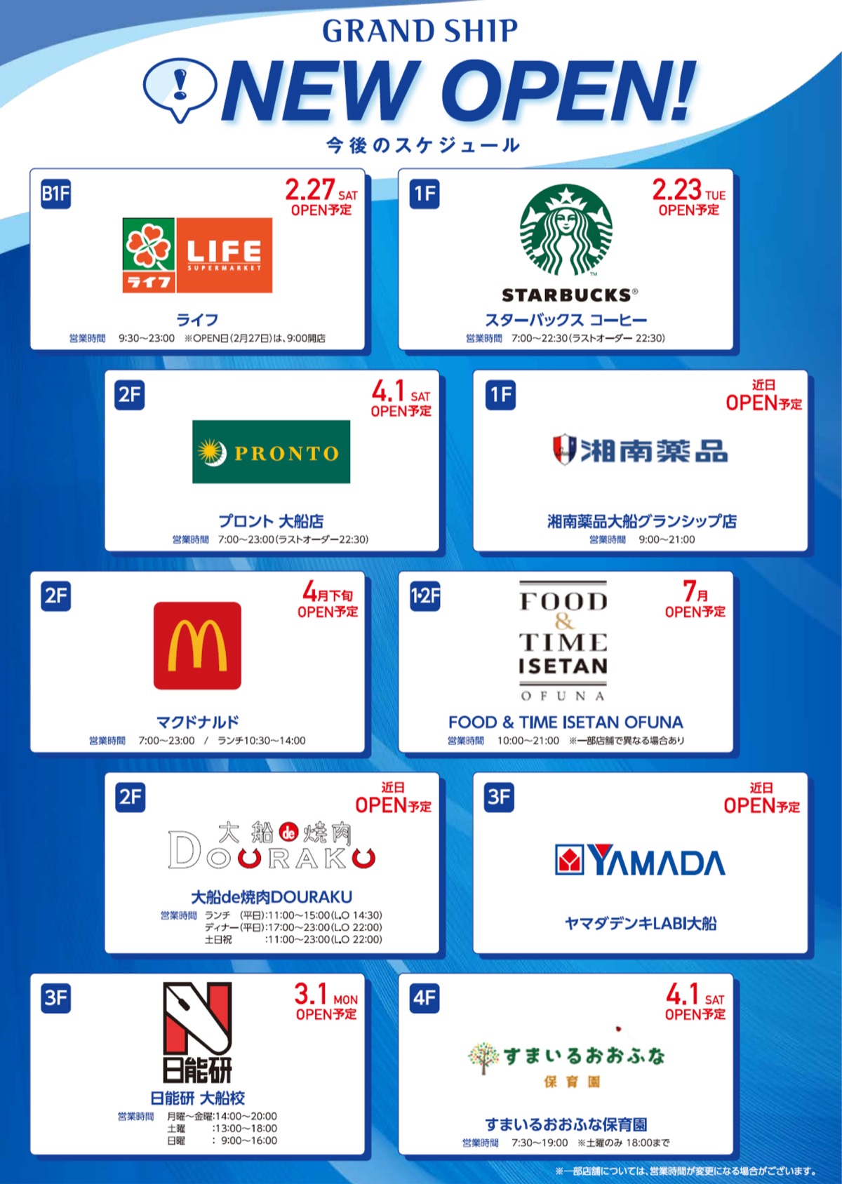 そのほかのテナントは、日能研大船校(3月1日)、プロント大船店、すまいるおおふな保育園(4月1日)、マクドナルド(4月下旬)、FOOD&TIME ISETAN OFUNA(7月)、湘南薬品大船グランシップ店、大船de焼肉DOURAKU、ヤマダデンキLABI大船(近日)がオープン予定だ。