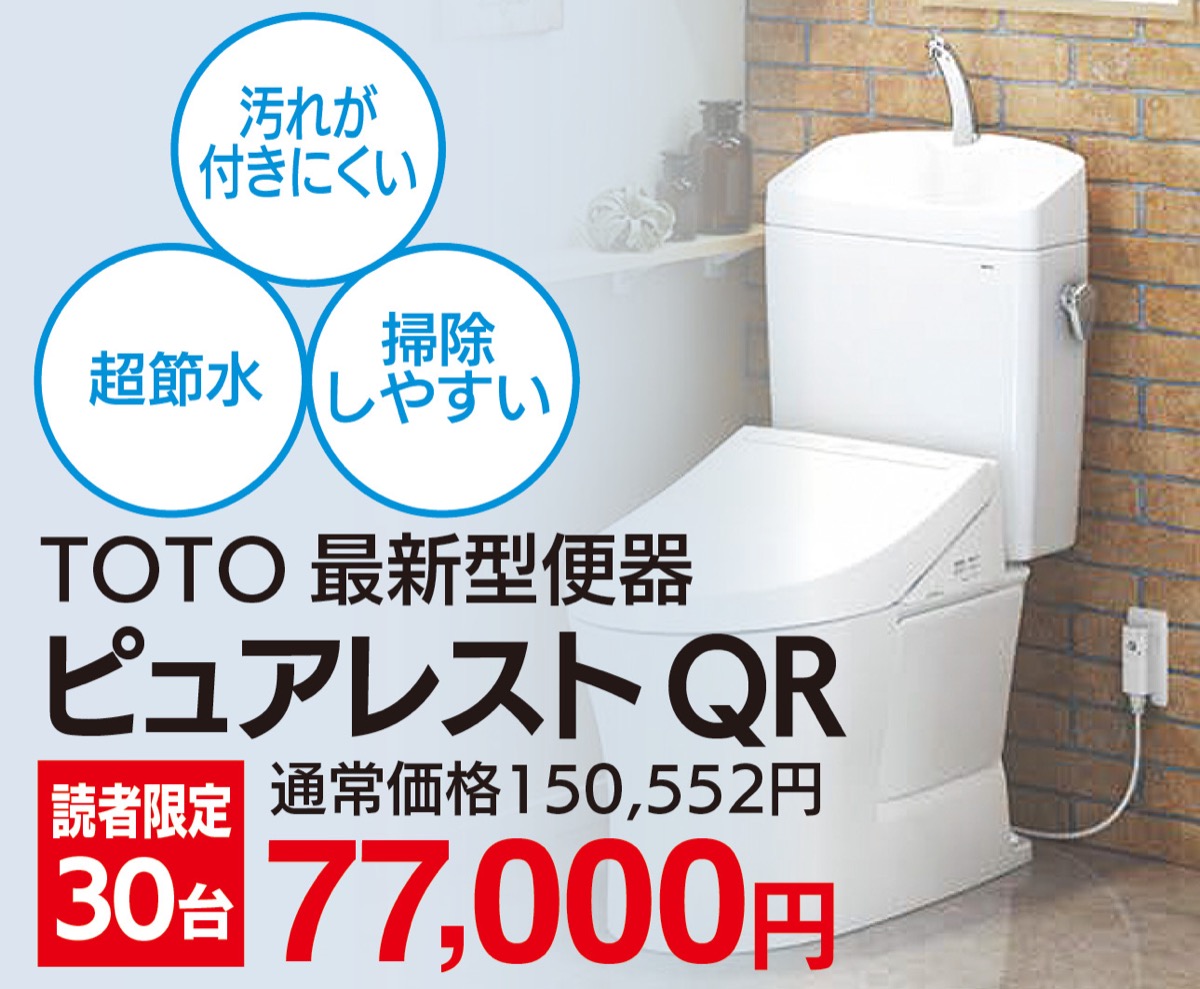 現在、同店ではTOTOの最新型トイレ「ピュアレストQR」を、通常の49%オフ・7万700円(工事費・処分費込)の特価で提供中。「浮いた予算でシャワートイレ(別料金)を付けるのもオススメ」と担当者。点検・出張・見積も無料。感染症対策も実施中。