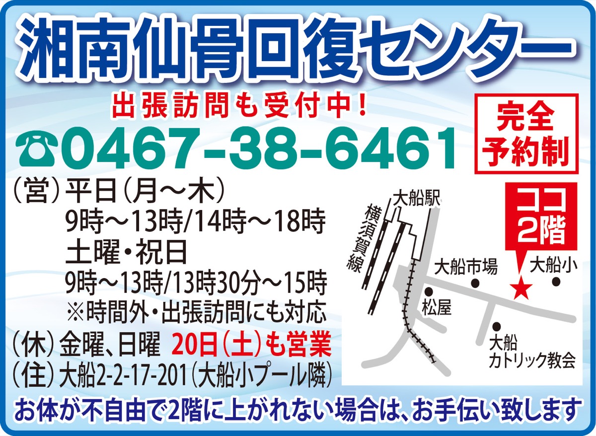 大船駅徒歩5分の「湘南仙骨回復センター」はこのほど、2周年を迎えた。開院以来、骨盤にある”仙骨”の歪みを整え、肩こりや腰痛、不眠、坐骨神経痛、脊柱管狭窄症等の改善に取り組んできた同院。600人を超える来院者の1人である大橋杲生さん(81・大船在住)は3年前、自転車から転倒し、左膝の複雑骨折を経験。また左手が動かなくなったため病院へ行くと、脳梗塞と診断され杖を突きながら生活していたという。
