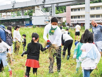 6月5日、6日には、選手やスタッフ、支援者、スポンサー企業の関係者、また近隣のふじづか子どもの家の児童らのべ80人が参加して、建設予定地で雑草の除去が行われた。