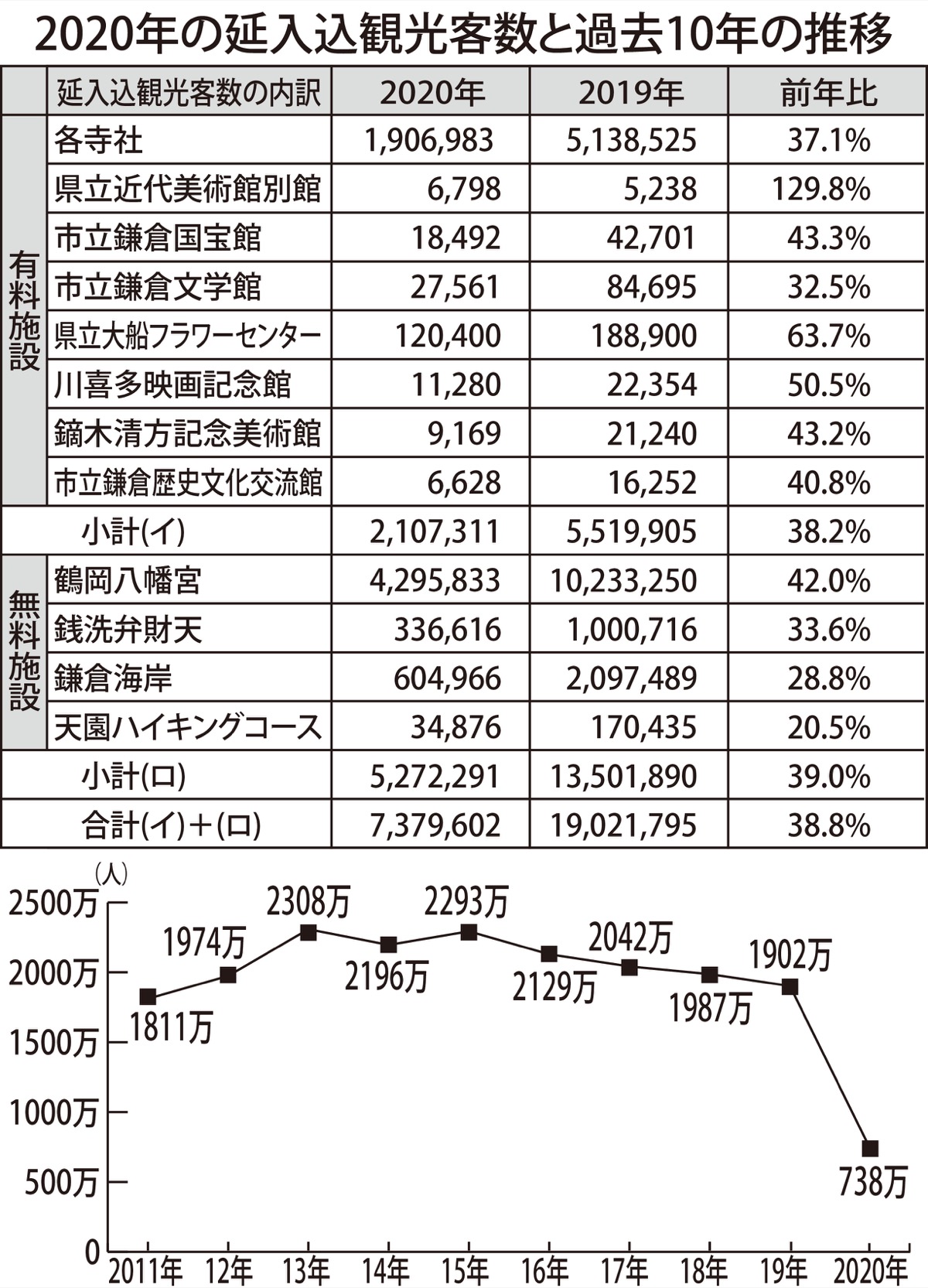 鎌倉市は6月7日、2020年中に市を訪れた観光客の推定延べ人数が738万人だったと発表した。前年の1902万人に比べマイナス61・2%と大幅に下回った。統計が残る1963(昭和38)年以降で過去最少。