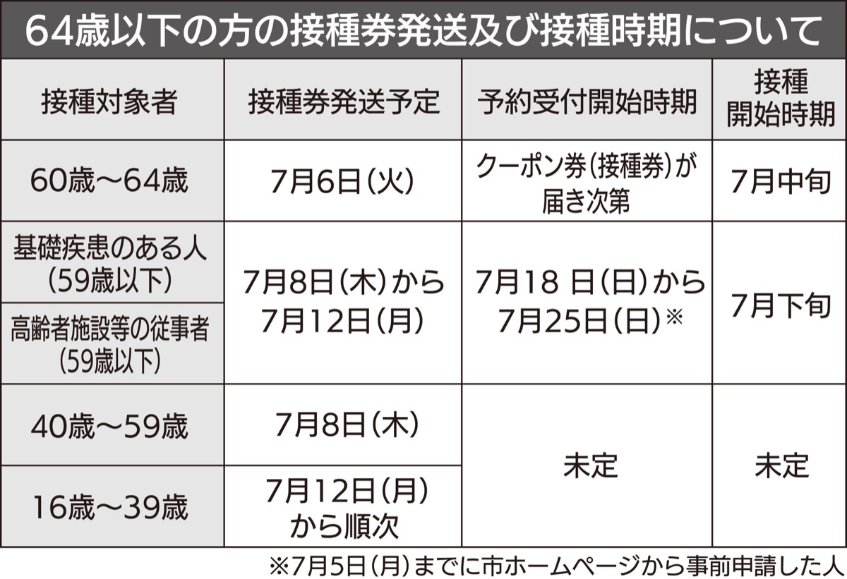 64歳以下の人(約10万2000人)への接種券送付は、60歳から64歳以下の人(約1万人)に対しては7月6日から、40歳から59歳の人(約5万5000人)は7月8日から、16歳から39歳の人(約3万7000人)は7月12日から、順次発送される。