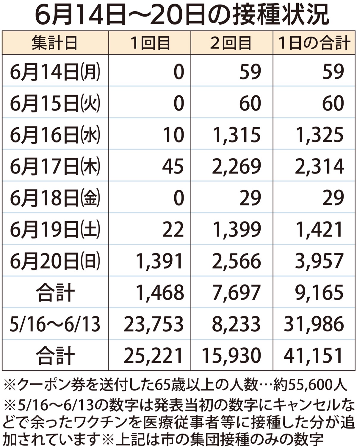 5月16日から始まった65歳以上の人への接種については、6月20日の時点で対象者の45%にあたる2万5221人が1回目の接種を終えた=表。