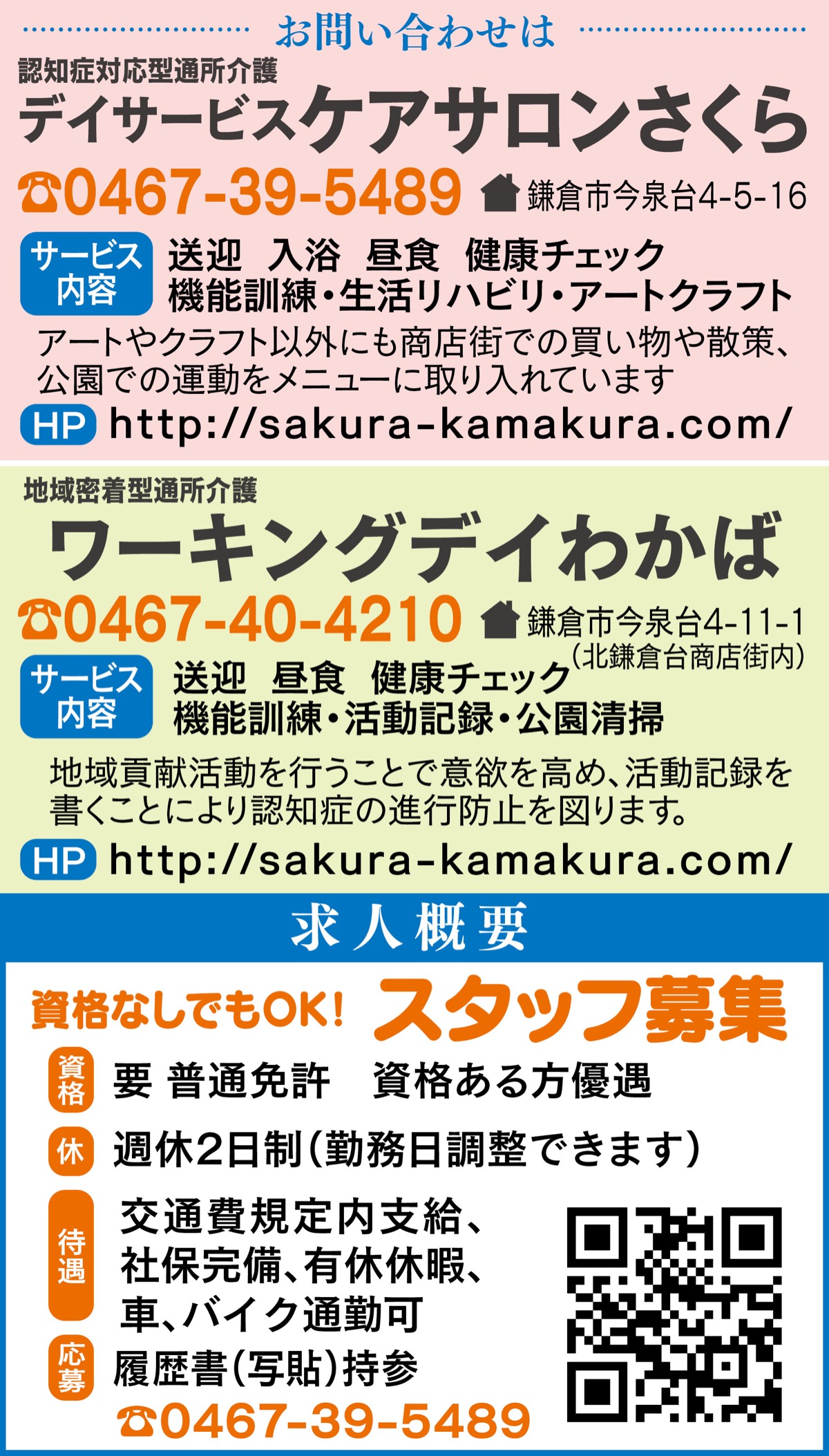 今泉台で、認知症の人を対象とした2カ所のデイサービス施設を運営する(株)さくらコミュニティーケアサービスでは利用者を募集している。