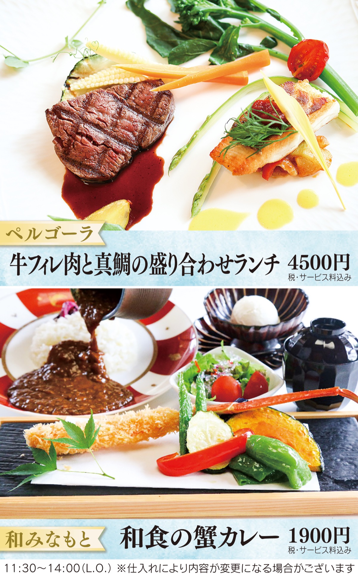 ランチは、いずれも午前11時半〜午後2時(L.O.)。ラウンジ・テラスは8時まで。予約・問い合わせは、ペルゴーラ【電話】0467・25・5125、和みなもと【電話】0467・25・5126へ。